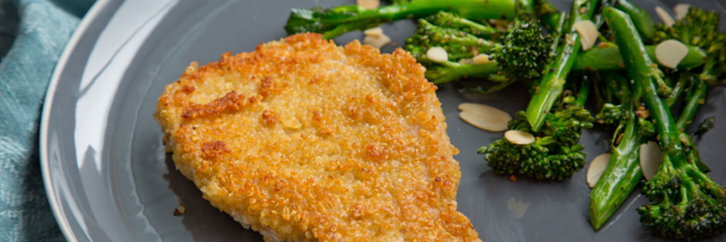 I love these as a nice alternative to regular grilled pork chops and the quinoa gives them a great crunch. The chops are so tasty with the Parmesan, but you could use another cheese if you prefer. This is a lovely light dinner that could also be served with sweet potato mash or a salad.