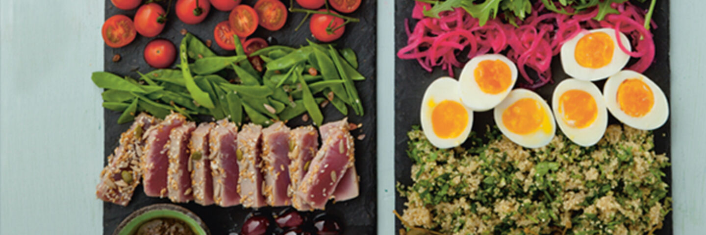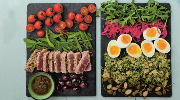 To serve, roughly tear the basil and coriander leaves and mix them with quinoa. Arrange the ingredients in rows on a large serving platter, serving the black olive paste on the side and allowing everyone to help themselves.