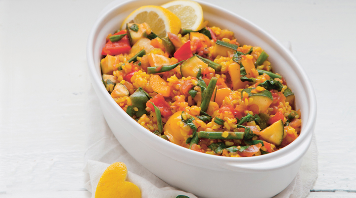 This tasty vegetable equivalent of a traditional Spanish seafood dish is always one of our most popular recipes. It’s naturally low in fat and calories and high in nutrition and fibre.